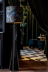 Lamp made of hand-formed black glass. Chrome-plated metal accessories, black textile braided cable, floor switch.