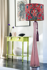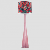 Lamp made of hand-formed transparent glass covered with a light lavander coating. Chrome-plated metal accessories, black textile braided cable, floor switch.