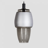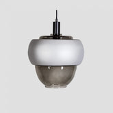 The lampshade is made of colorless, hand-formed glass, then painted with transparent anthracite paint. The silver strip is hand-painted with matt paint.
