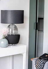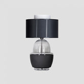 The lamp base is made of colorless, hand-formed glass, painted with black, transparent paint. The belt is painted with matte black paint.