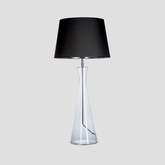 The lamp base is made of colorless, hand-formed glass.