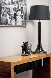The lamp base is made of colorless glass, hand-formed and then painted black.