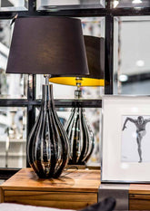 Lamp base made of hand-formed, colorless glass with black stripes in the glass mass