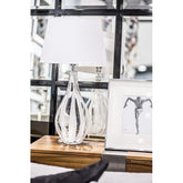 Lamp base made of hand-formed, colorless glass with white stripes in the glass mass.