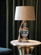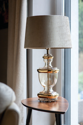 Handmade in tranparent glass painted in transparent and metallic REAL GOLD Bulbholder and pipe inside the base - steel painted in REAL GOLD.