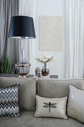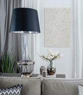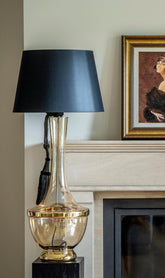Handmade transparent glass painted in transparent black and metallic REAL PLATINUM Bulb holder and pipe inside the base steel painted in chrom.