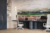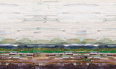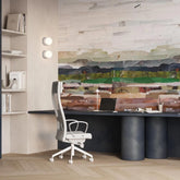 The "Arroz" wallpaper is a painterly interpretation of a rural landscape, depicted using a unique paper collage technique. Hundreds of hand-torn strips create a multi-layered image of nature pastel skies, gentle mountain ranges, green fields, and soil textures, which combine to create a peaceful, almost meditative composition. The pattern conveys an atmosphere of peace, space, and order like a view of rice fields stretching to the horizon. The "Arroz"