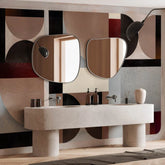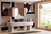"Opus" is a graphic composition inspired by modernist abstract painting and the aesthetics of the Bauhaus. The pattern is composed of precisely arranged geometric shapes – semicircles, squares, rectangles, and lines creating a modular arrangement with a rhythmic character. Each element has been meticulously crafted in terms of texture and color: surfaces reminiscent of concrete, polished stone, matte plaster, and smooth, painterly transitions appear. The composition is enclosed within expressive blocks, giving the whole an impression of ordered graphic architecture. "Opus" is a tribute to geometric abstraction and structural minimalism, which acts in the interior like a mural bold, artistic, and full of character.