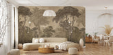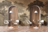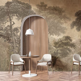 Amidst the ever-expanding urban jungle, we retreat to our homes, shaping spaces that reconnect us with nature. Hood brings the forest indoors with a refined, slightly colonial charm. Inspired by vintage engravings, the design depicts an ancient, untouched wilderness. The blend of earthy brown tones evokes the look of sepia photographs, infusing the space with an exotic ambiance and a touch of Victorian sophistication. The depth and perspective of the landscape enhance the sense of space, making the interior feel more expansive and visually striking.
