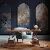 Its connection to the Harmony pattern—an 18th-century Dutch painting reproduction—adds a refined touch. The harmonious blend of beige, cream, and gray flowers against a deep blue background, highlighted with gold accents, creates a stunning composition.