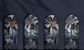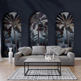 Robinson Crusoe, a classic adventure novel, inspires a dark, mysterious, yet exotic pattern. Tall palm trees add height, while unique colors make it ideal for interiors without greenery. Its bold foreground captivates, softened by a misty mountain backdrop.