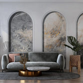 Harmony reproduces an 18th-century Dutch painting, blending beige, cream, and gray flowers on a shaded gray background, accented with gold. Its rich, ornate design beautifully complements minimalist and classic interiors.