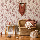 Mimi offers a whimsical take on English-style wallpaper for children. Delicately drawn flowers paired with adorable bunnies create a design that is both charming and refined for a child's room. The beige-toned green plant elements allow for seamless coordination with both white and wooden furniture, adding warmth and elegance to the space.