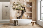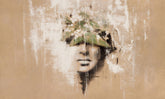 Castagna portrays an enigmatic female visage concealed behind an intricate plant motif. Soft green leaves and petite white blossoms infuse the mysterious portrait with romance and lightness. The subtle color palette enhances any understated, minimalist interior.